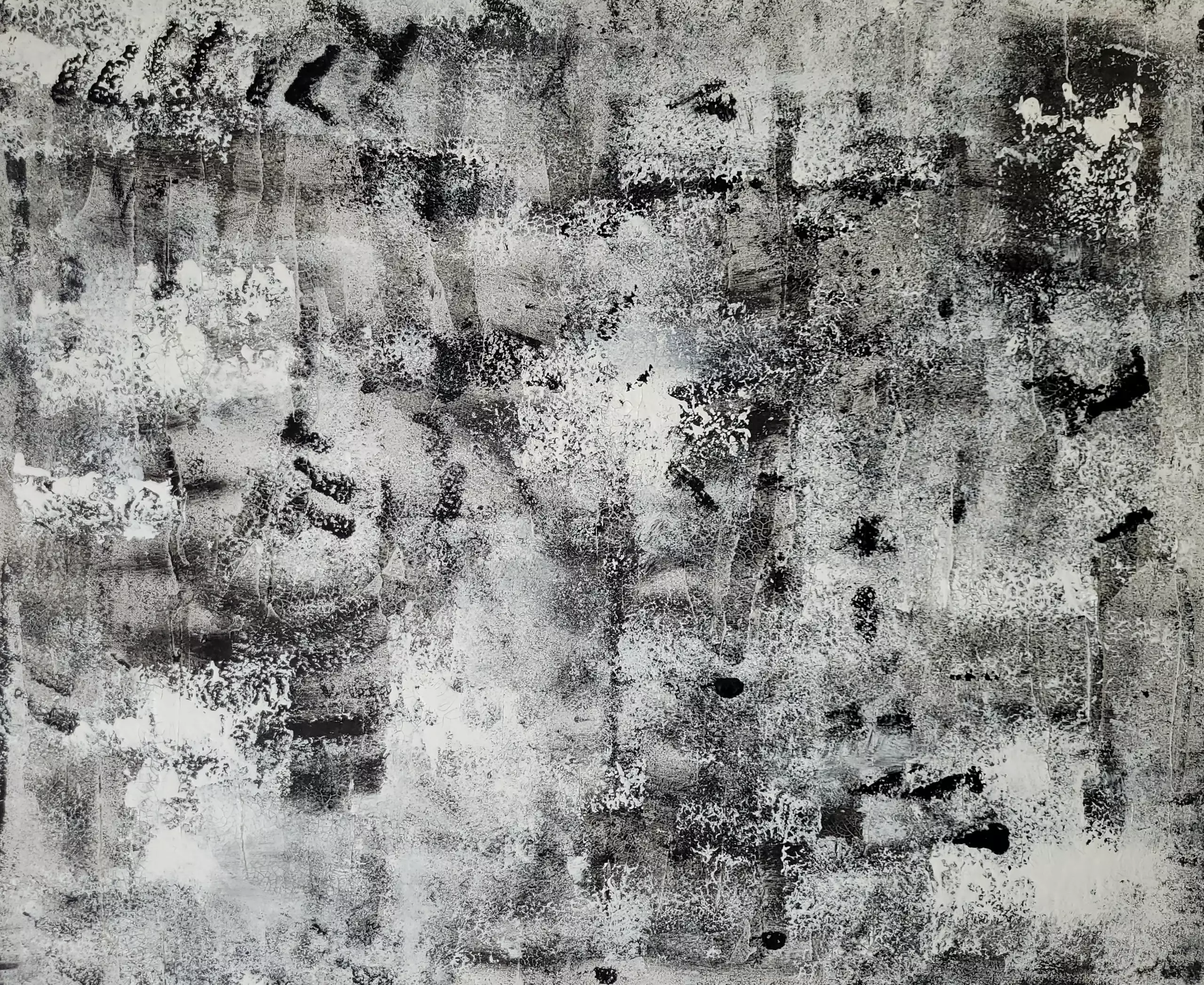 Cette peinture en nuances de noir, blanc et gris déploie une atmosphère troublante et poétique. Les textures granuleuses et les formes diffuses rappellent les tourments d’une tempête de neige, où chaque trace semble effacée par le souffle du vent. Au milieu du chaos, des fragments de silhouettes émergent timidement, comme des souvenirs fugaces gravés dans la mémoire. L’œuvre capture cette étrange révélation d’un visage entrevu dans l’aveuglement d’un blizzard — fragile, insaisissable, mais inoubliable.